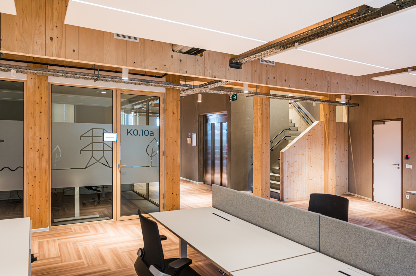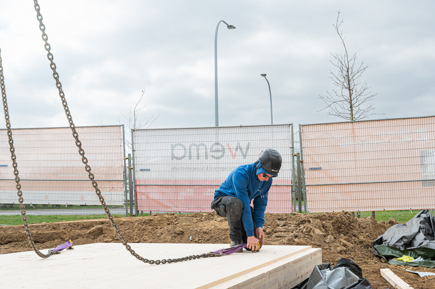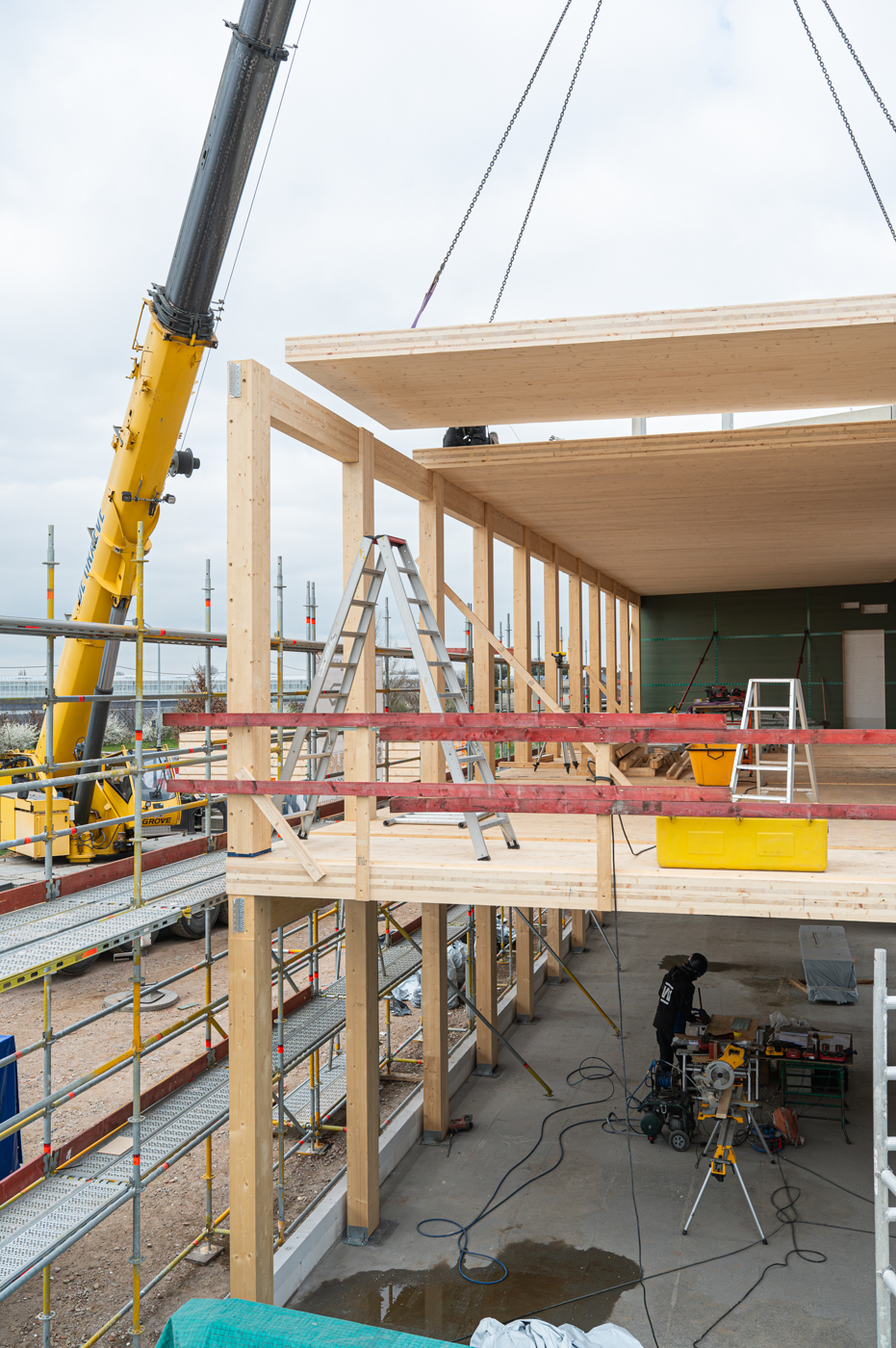 Dankzij de hoge graad van prefabricatie kon de houtbouw zelf in amper acht weken worden gemonteerd. Door het project in drie verticale fases op te delen en regelmatig vochtmetingen uit te voeren, bleef het houtvochtgehalte steeds onder controle – cruciaal voor duurzaam bouwen met hout.