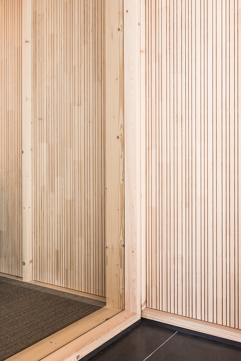 Er werd geopteerd voor een demonteerbare, bio-ecologisch verantwoorde houtbouwinvulling onder de bestaande stalen constructie. Het ontwerp is vormstabiel op zichzelf en moest niet verankerd worden aan de vloer. De kasten werden ontworpen om de draagstructuur te zijn. Er werden enkel droge verbindingen en droge afbouwmethodes gebruikt. Via het BIM-model zijn alle ingezette materialen traceerbaar in functie van later hergebruik.